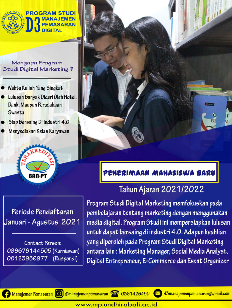 Bagi kalian yang masih bingung ingin kuliah dimana? Atau yang mau Kuliah sambil Kerja. Ayok jangan lupa untuk mendaftar di Program Studi D3 Manajemen Pemasaran Digital (Digital Marketing) Universitas Dhyana Pura. Pada program studi ini, kalian akan mendapatkan banyak pengetahuan mengenai pemasaran dengan menggunakan media digital. Dimana media digital sangat penting untuk dapat bersaing pada Industri 4.0. Adapun keahlian yang akan kalian peroleh antara lain :