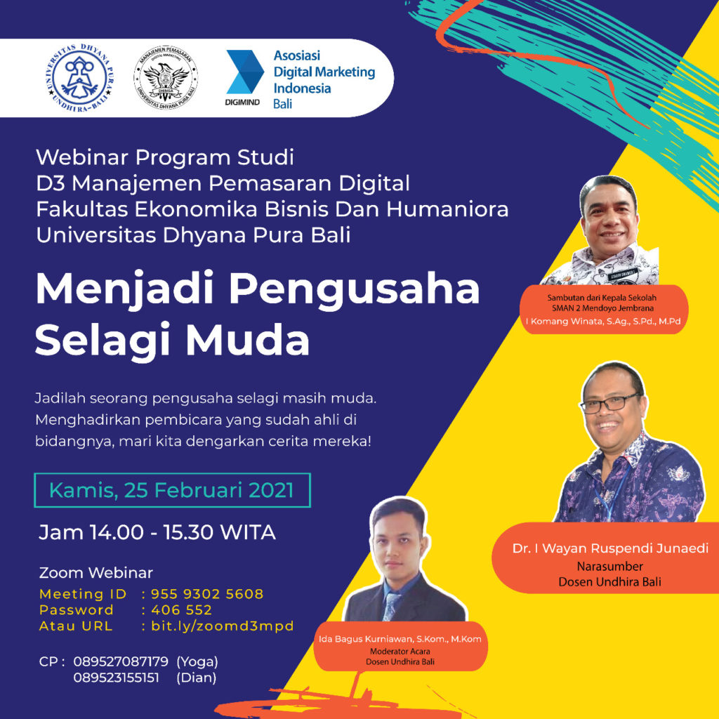Badung, 25 Februari 2021 telah diselenggarakan Webinar Program Studi D3 Manajemen Pemasaran Digital “Menjadi Pengusaha Selagi Muda”. Kegiatan ini merupakan rangkaian kegiatan pengabdian masyarakat dan sosialisasi program studi Prodi D3 Manajemen Pemasaran Digital kepada siswa SMA/SMK Jembrana Bali. Kegiatan webinar ini melibatkan HIMA (Himpunan Mahasiswa) Prodi D3 Manajemen Pemasaran Digital. Peserta dari kegiatan ini siswa SMAN 2 Mendoyo dan SMK Marsudirini. Pembicara dalam kegiatan ini adalah Bapak Kaprodi D3 Manajemen Pemasaran Digital Dr. I Wayan Ruspendi Junaedi, SE.,MA. Dalam kegiatan ini beliau menyampaikan ada beberapa kiat dalam menjadi pengusaha selagi muda yaitu Pelajari Potensi dan lihat Kebutuhan Pasar, Sepakat dengan tim atau keluarga, Pilih Usaha yang di geluti, Perencanaan Usaha, Membuat Pembukuan sederhana, Belajar dari yang sudah Ahli dan Merekrut SDM.