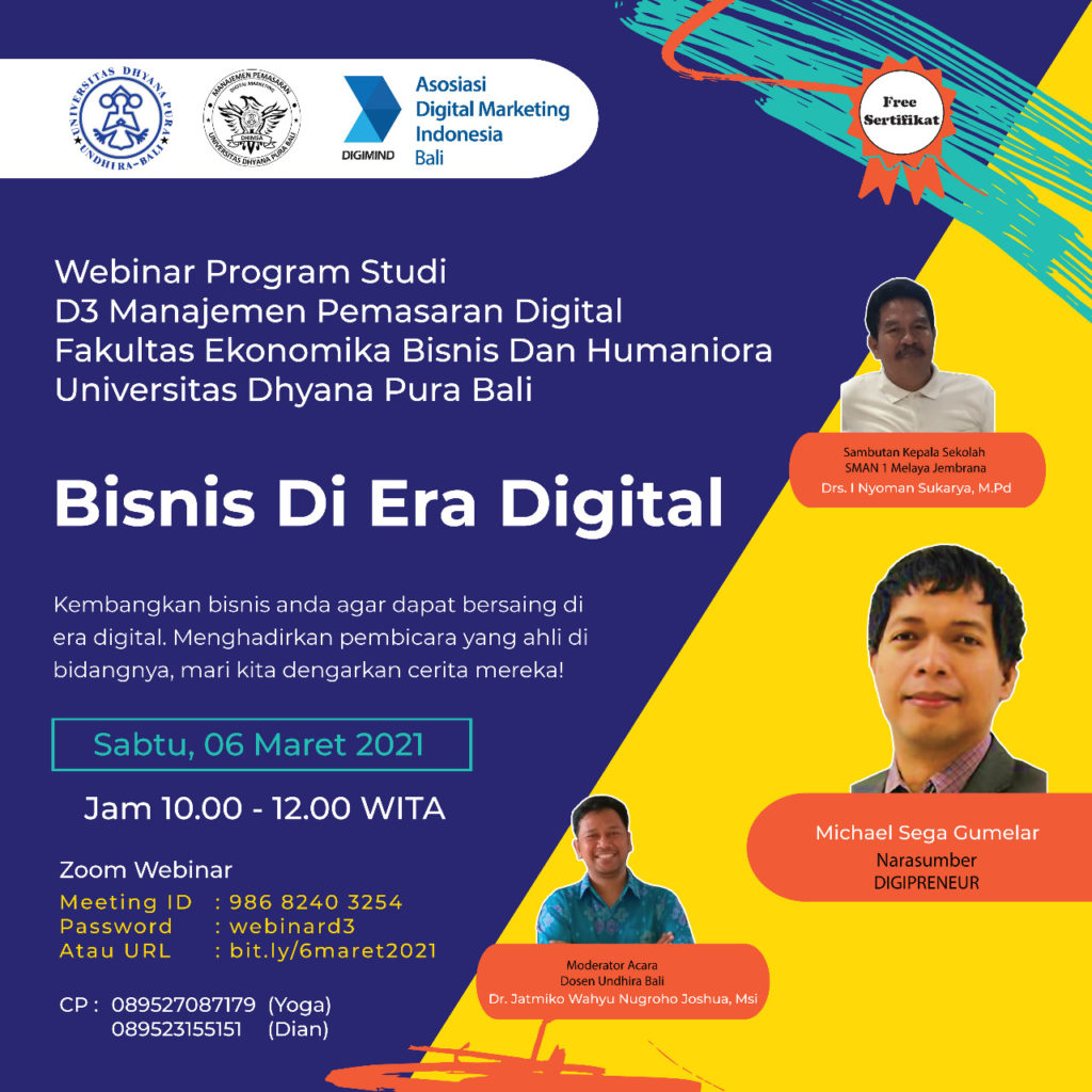 Badung, 6 Maret 2021 telah diselenggarakan Webinar Program Studi D3 Manajemen Pemasaran Digital “Bisnis di Era Digital”. Kegiatan ini merupakan rangkaian kegiatan pengabdian masyarakat dan sosialisasi program studi Prodi D3 Manajemen Pemasaran Digital kepada siswa SMA/SMK Jembrana Bali. Peserta dari kegiatan ini adalah siswa SMAN 1 Melaya. Pembicara dalam kegiatan ini adalah Bapak Kaprodi D3 Manajemen Pemasaran Digital Prof. Michael Sega Gumelar. Dalam kegiatan ini beliau menyampaikan bentuk bisnis yang dapat dikembangkan di era digital ini. Dengan kegiatan ini diharapkan generasi milenial dapat memiliki ide membangun bisnis digital di era pandemi ini.