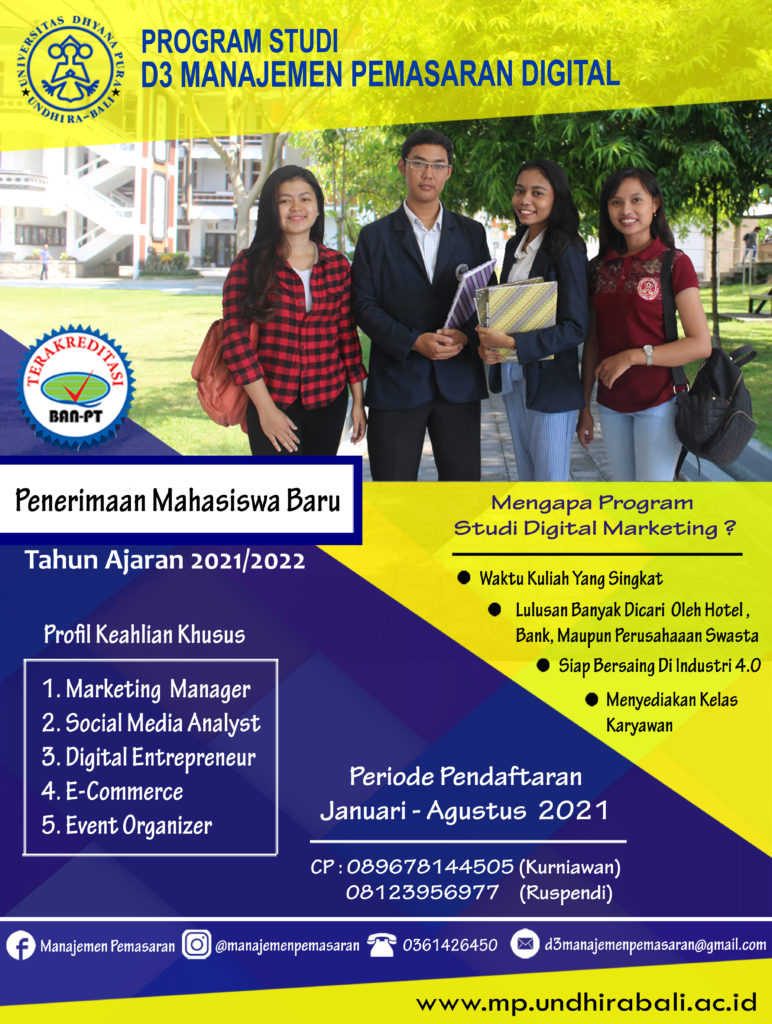 Ditengah pandemi Covid-19 pemasaran produk secara digital (digital marketing) merupakan salah satu solusi. Bagi teman-teman yang ingin menjadi expert dalam digital marketing ayok tunggu apa lagi segera buruan daftar di program studi D3 Manajemen Pemasaran Digital Universitas Dhyana Pura. Pada program studi ini, kalian akan mendapatkan banyak pengetahuan mengenai pemasaran menggunakan media digital. Dimana media digital sangat penting untuk dapat bersaing pada Industri 4.0. Adapun keahlian yang akan kalian peroleh antara lain :