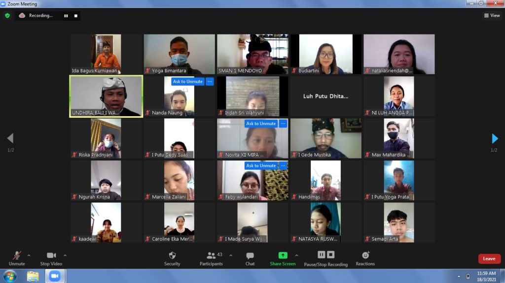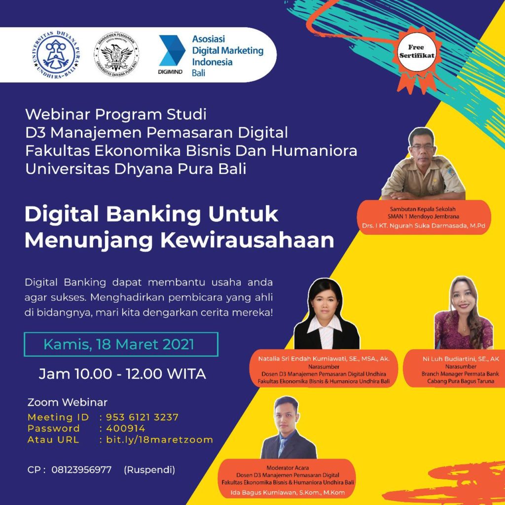 Telah diselenggarakan webinar dengan tema “Digital Banking Untuk Menunjang Kewirausahaan” pada hari Kamis, tanggal 18 Maret 2021. Kegiatan ini merupakan bentuk kerjasama antara Prodi D3 Manajemen Pemasaran Digital Universitas Dhyana Pura, SMAN 1 Mendoyo, SMAN 4 Singaraja dan Bank Permata. Acara ini dimulai dengan sambutan oleh Bapak Kepala Sekolah SMAN 1 Mendoyo Bapak Drs. I Ketut Ngurah Suka Darmasada., M.Pd yang dilanjutkan dengan presentasi oleh kedua Narasumber. Adapun Narasumber dalam kegiatan webinar ini adalah Ibu Ni Luh Budiartini, SE., Ak beliau adalah Branch Manager Bank Permata Legian dan Ibu Natalia Sri Endah Kurniawati, SE.,MSA.,Ak yang merupakan Dosen D3 Manajemen Pemasaran Digital Universitas Dhyana Pura. Adapun moderator webinar adalah Bapak Ida Bagus Kurniawan, S.Kom.,M.Kom, yang menjadi pemandu acara dari awal hingga akhir acara. Dalam pemaparannya Bu Budi menyampaikan bahwa menentukan selling point dan memviralkan usaha pada social media adalah langkah yang perlu dilakukan untuk membangun usaha dengan media digital. Sedangkan Bu Natalia menyampaikan pengusaha perlu melakukan inovasi dan memperluas jangkauan lewat marketplace. Kegiatan webinar berjalan dengan baik dan lancar, terdapat antusiasme dari peserta webinar terbukti dengan banyaknya jumlah penanya. Kegiatan ini selain bertujuan menginformasikan mengenai digital banking untuk menunjang kewirausahaan kegiatan ini juga bertujuan untuk mengenalkan Prodi D3 Manajemen Pemasaran Digital Universitas Dhyana Pura secara lebih luas lagi.