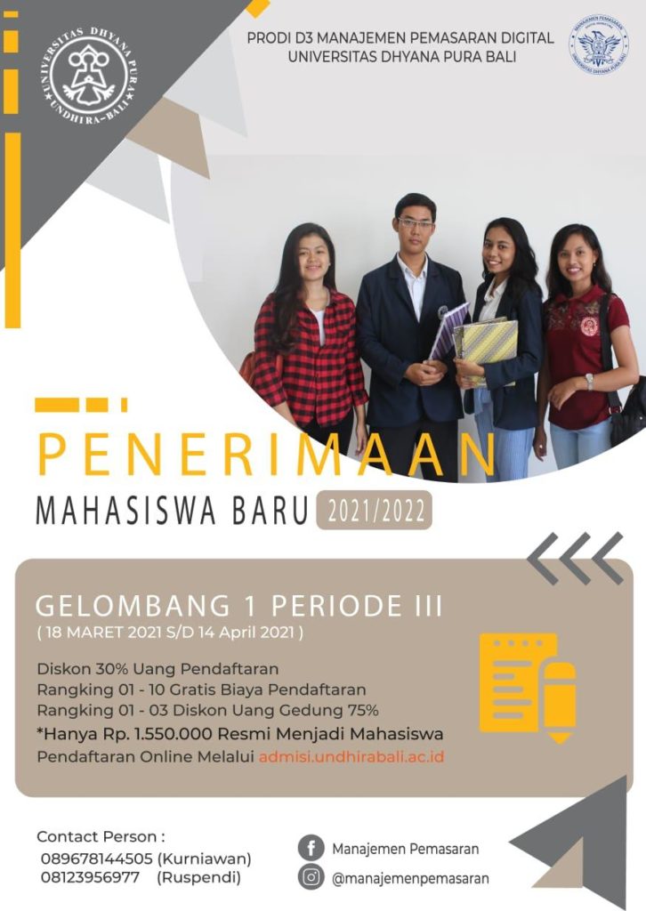 Bagi teman-teman yang masih bingung mau kuliah dimana? dan bingung apakah bisa membagi waktu dengan pekerjaan, jangan bingung lagi!!! Program Studi D3 Manajemen Pemasaran Digital (Digital Marketing) Universitas Dhyana Pura menyediakan kelas sore. Jadi bagi teman-teman yang sedang bekerja dijamin pasti bisa tetap berkuliah. Dan jika teman-teman mendaftar di periode ini ada potongan uang pendaftaran 30%. Jadi tunggu apa lagi segera daftarkan dirimu di Program Studi D3 Manajemen Pemasaran Digital Universitas Dhyana Pura. Bersama kami menjadi expert dalam digital marketing.