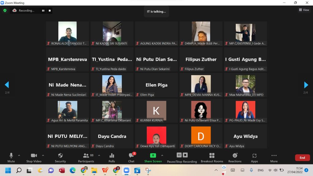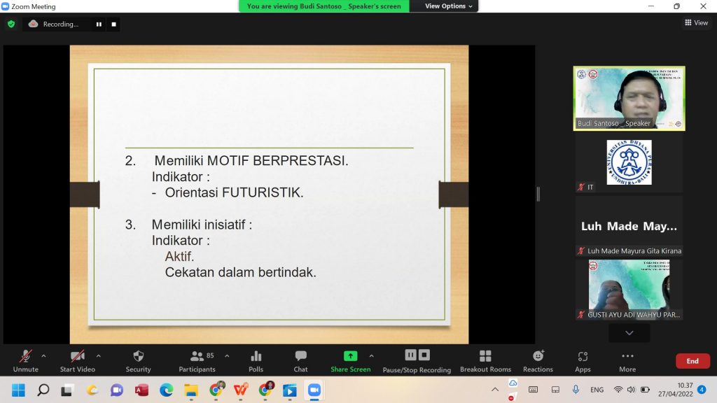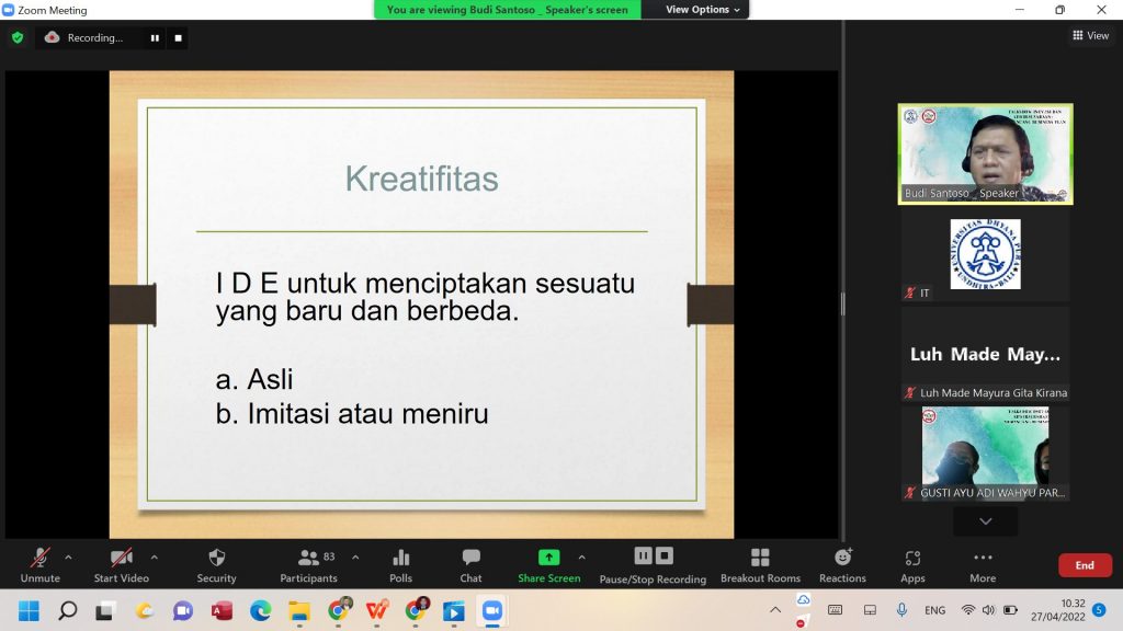 Rabu, 27 April 2022, telah diselenggarakan Talkshow Inovasi dan Kewirausahaan : Merancang Business Plan. Kegiatan ini merupakan salah satu rangkaian pada Pekan Kreativitas Mahasiswa yang dilaksanakan oleh HIMA Prodi D3 Manajemen Pemasaran. Pada kegiatan ini terdapat dua Narasumber yaitu Bapak Dr. Drs. R. Tri Priyono Budi Santoso, MM dan Bapak Dr. I Wayan Ruspendi Junaedi SE.,MM. Kegiatan dibuka dengan sambutan oleh Bapak Dekan Fakultas Vokasi Bapak Putu Steven Eka Putra, ST.,M.Par.,Dip.HOS. Adapun MC dan moderator dalam acara ini adalah Gusti Agung Ayu Made Andhini Susila. Dalam sambutan Bapak Dekan Fakultas Vokasi menyampaikan pentingnya inovasi di masa kini. Setelah sambutan acara dilanjutkan dengan pemaparan dari para Narasumber. Dalam pemaparannya Bapak Dr. Budi menyampaikan pentingnya membangun mental mahasiswa agar menjadi percaya diri dan memiliki inovasi serta membentuk jiwa wirausaha yang mandiri. Sedangkan Bapak Dr. Ruspendi dalam pemaparannya menyampaikan merancang business plan memerlukan waktu dan belajar dari yang telah memiliki pengalaman. Kegiatan berlangsung dengan lancar dan mendapatkan antusiasme yang tinggi dari peserta. Adapun peserta yang mengikuti talkshow sebanyak 95 Peserta.